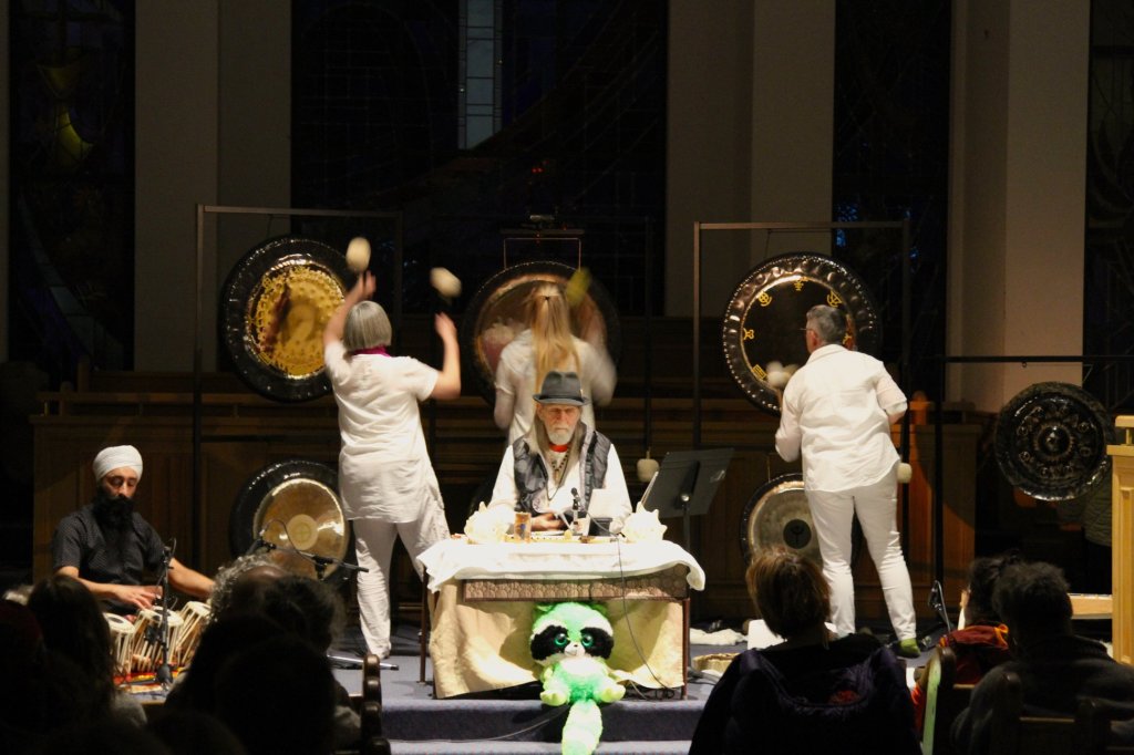 At College Street United Church in Toronto, Canada, 140 people gathered to take in the vibration of gongs and the music of the tabla & hang, the oboe, and Don Conreaux’s shruti songs (songs and poems of revelation). The collaboration was an improvised Concert for Peace & Humanity with talented local musicians including Gurpreet Chana, Derrick Tu, Barb McIntosh, Laurie Giller, as well as performance artist, lo bil. Performers met together for 2 hours before the start of the concert to meet and then allow the sounds to unfold in ‘deep listening’ (Oliveros, 2015) style of collaboration.