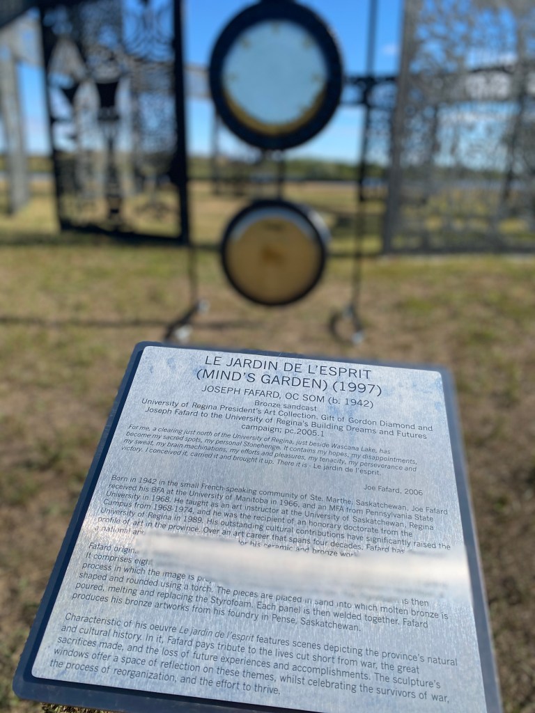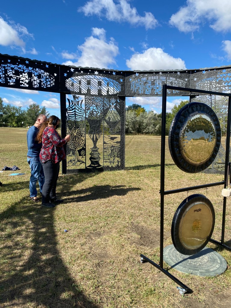 Along with Dr. Rebecca Caines and John Campbell, sound recording wizard, we tested gong sound at an outdoor site near Wascana Lake, Regina, Canada at Joe Fafard’s sculpture: Le Jardin de L’espirit (Mind’s Garden) (1997).