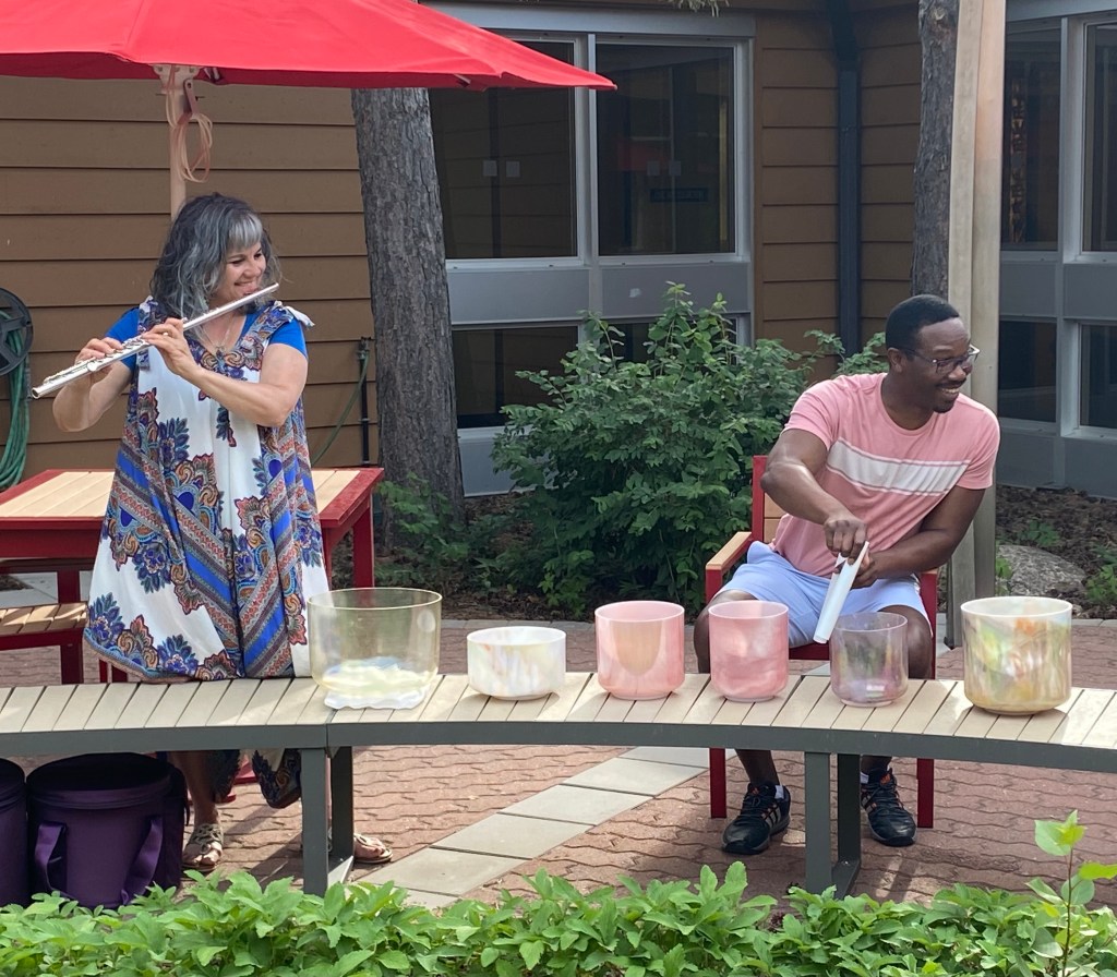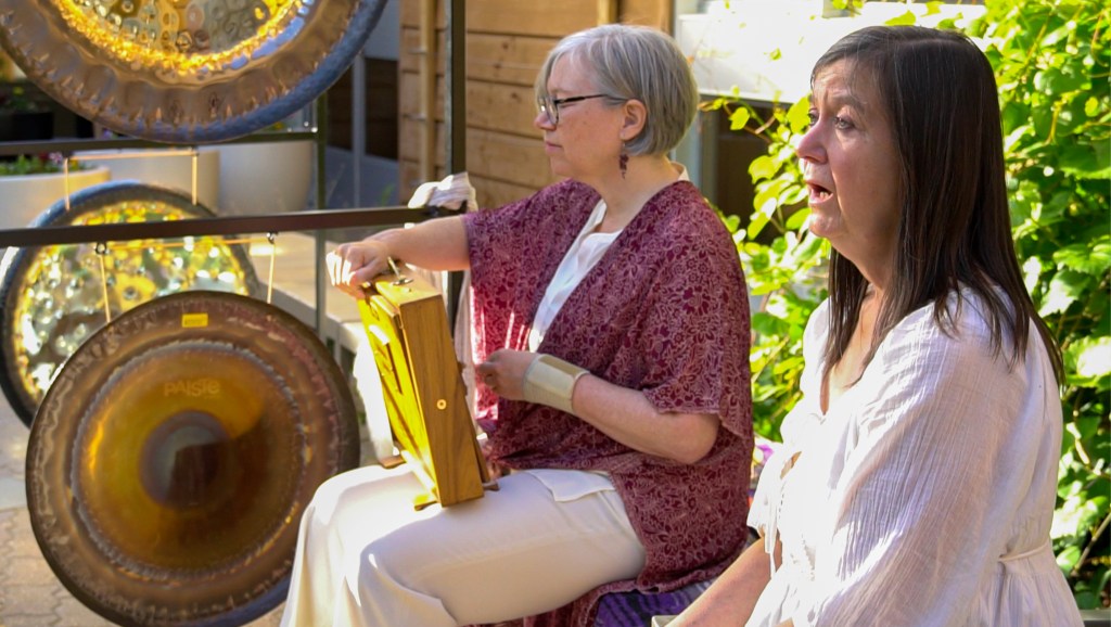 During the 10 Nights of Gong research talks and gong baths, I worked and played with musicians and artists at the Neil Balkwill Civic Arts Centre as well as at the Art Gallery of Regina. The following musicians and artists collaborated with gong sounds: Rebecca Caines, Dami Egbeyemi, Helen Pridmore, Kathryn Ricketts, Sundance Robson, Tara Semple, and D. Andrew Stewart. These collaborations were in the spirit of the gong teachings and research – improvised with no rehearsal. Pictured below: myself with vocalist Helen Pridmore; Tara Semple (flute) and Dami Egbeyemi (crystal bowls) at the Neil Balkwill Civic Arts Centre’s outdoor courtyard, Regina.